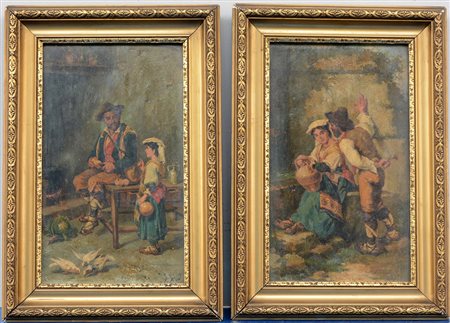 Scuola napoletana, coppia di olii su tavola raffiguranti scene popolari (cm 32x19,5) firmati in basso a destra