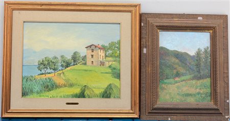 Lotto di due dipinti ad olio raffiguranti paesaggi agresti, di autori differenti (cm 40x50 e 36x27), in cornici (difetti)