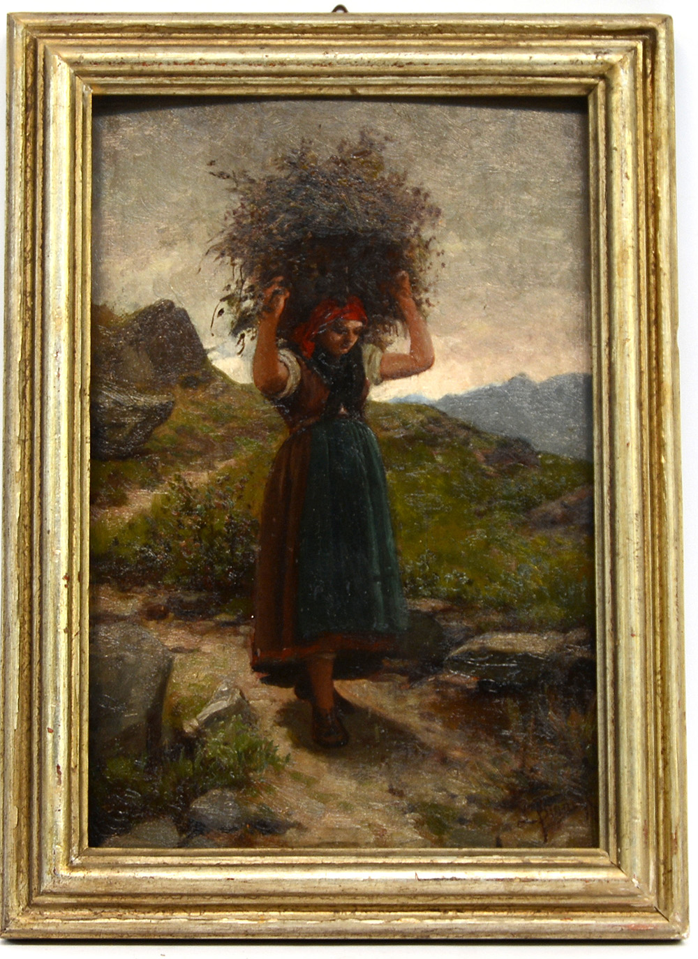 Luigi Bianchi 1827 1914 "Contadina con gerla", olio su tavola (cm 35x23,5) firmato in basso a destra, in cornice (difetti)