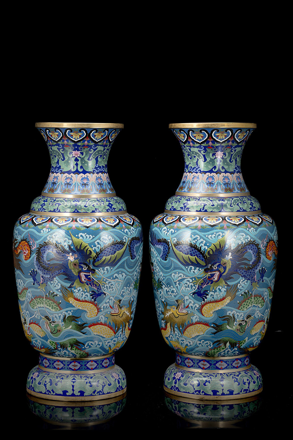 Coppia di vasi in metallo cloisonne decorato con draghi dai cinque artigli tra onde in tempesta e motivi floreali, con basi in legno (difetti) Cina, sec. XX (h. 77 cm.)