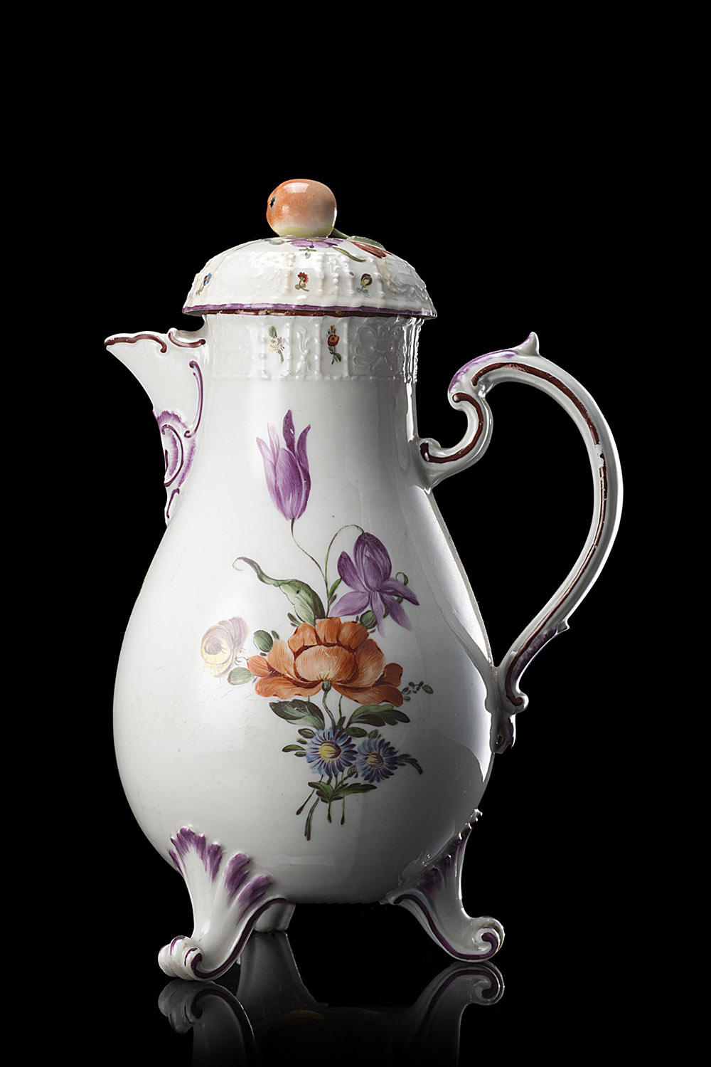 Caffettiera in porcellana decorata a a bouquet floreale, tre piedi a ricciolo, manico a doppia voluta. Profili in color porpora (h. cm 22) La porcellana è impressa con motivo rocaille sul collo e sul coperchio. Sotto al piede è presente etichetta cartacea di Schubert Antichità. Marca di fabbrica, Ludwigsburg, sec. XVIII Porcelain coffee pot. Ludwigsburg, 18th century