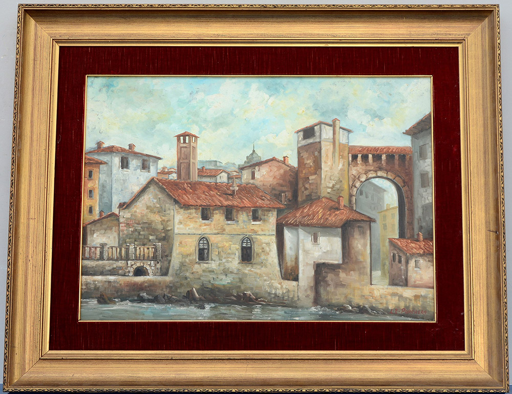 Luigi Erminio Porchera "Scorcio della vecchia Pavia" olio su tela (cm 50x70) firmato e datato in basso a destra e al retro, in cornice