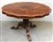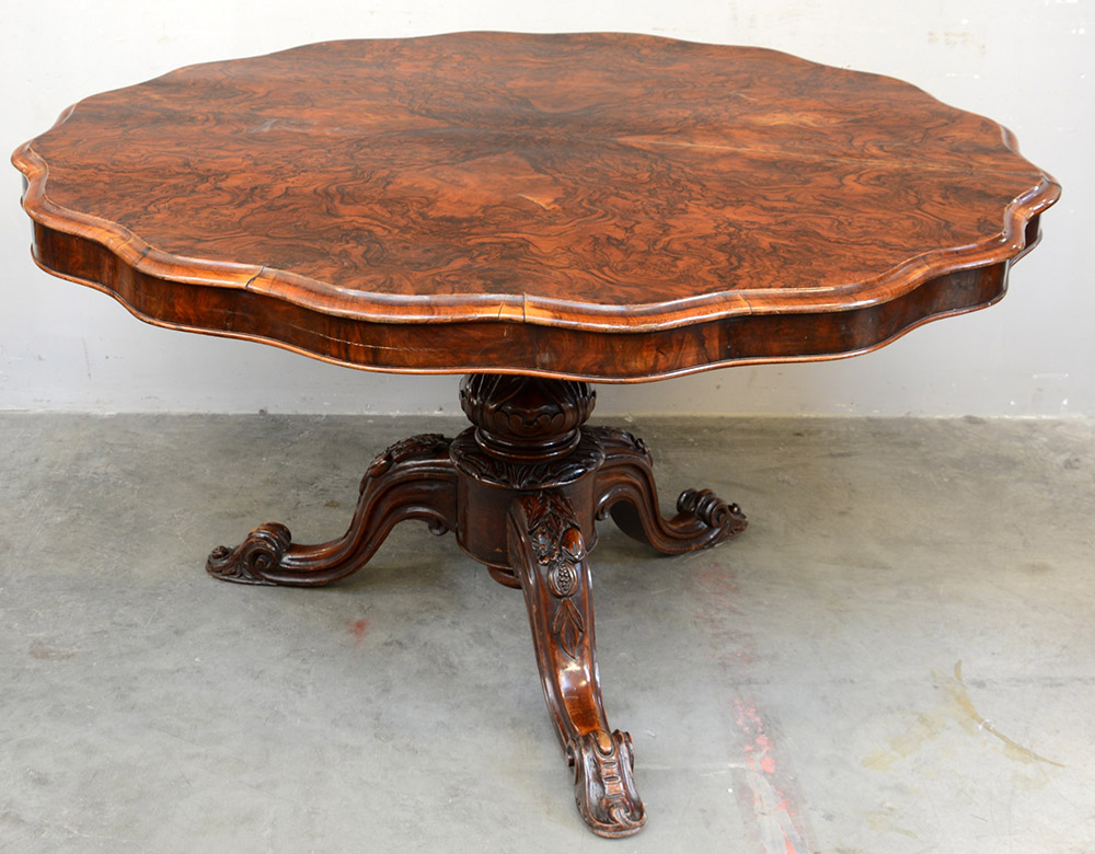 Tavolo con piano sagomato lastronato in radica. Montante centrale e base tripode (cm 95x140)(restauri)