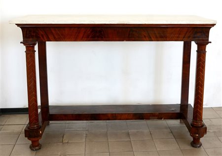 Grande console impiallacciata in mogano con montanti anteriori a colonne sfaccettate e decorate con filettature a contrasto, piano in marmo bianco. Secolo XIX (cm 155x107x60) (difetti)