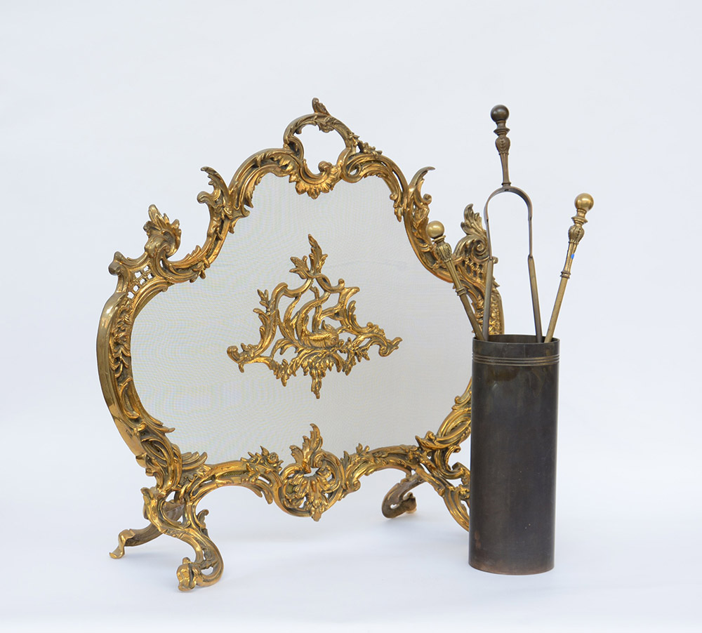 Lotto composto da un parascintille e tre attrezzi da camino con contenitore (difetti)