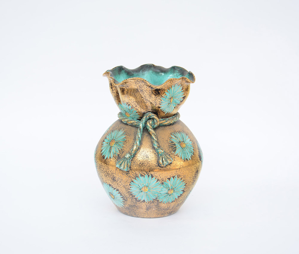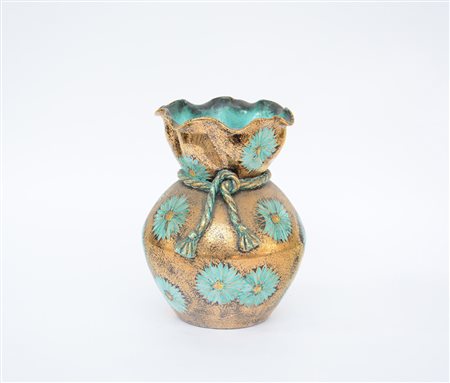 Vaso in ceramica smaltata decorato con margherite su fondo dorato (h cm 29)