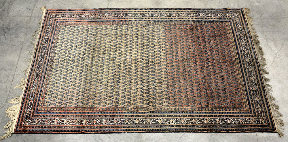 Tappeto indiano, secolo XX. Disegno con file di Boteh blu su fondo beige (cm 298x203) (difetti)