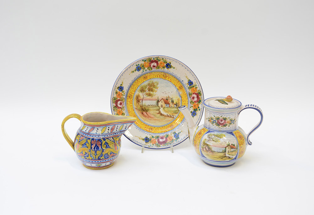 Lotto composto da una teiera con piatto da portata della manifattura Deruta, decorato a fiori e paesaggi, e un brocca per vino della manifattura Gualdo Tadino (difetti e restauri)