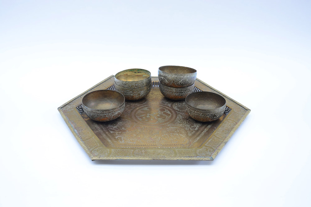 Manifattura asiatica, lotto composto da un vassoio esagonale e sei ciotole in ottone inciso (difetti)