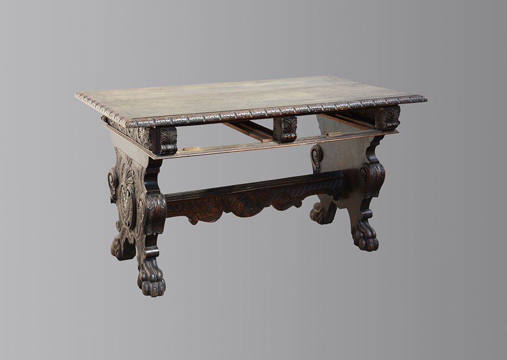 Tavolo in legno intagliato in stile neorinascimentale (cm 147x82x82)(mancante dei cassetti)