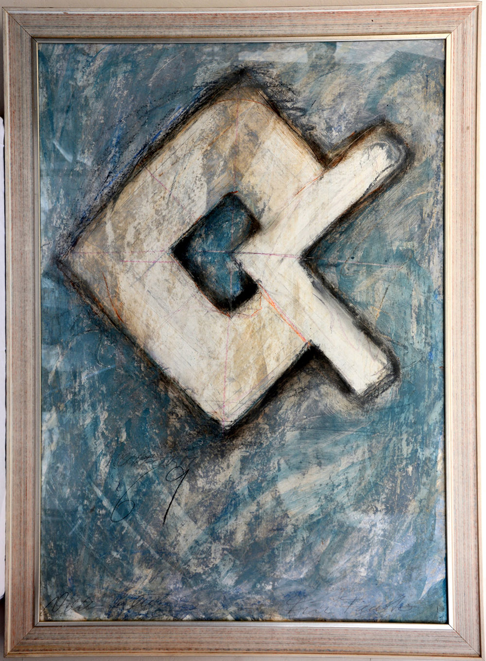 Firma indecifrata, "Composizione", pastelli colorati su carta (cm 100x70) firmato e datato a sinistra con dedica in basso, in cornice