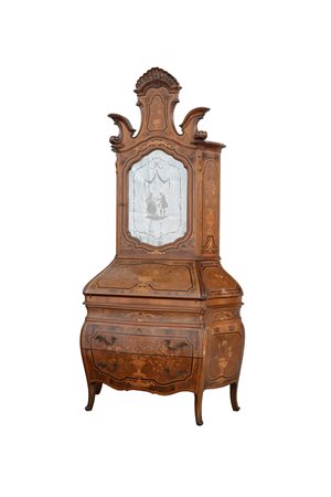 Trumeau di forma mossa lastronato in noce e intarsiato con vasi fioriti, foglie e volute. Parte superiore con anta a specchio incisa con scena galante, parte inferiore a tre cassetti e antina ribaltabile celante cassettini e vano. Piedi sagomati (cm 125x245x82)