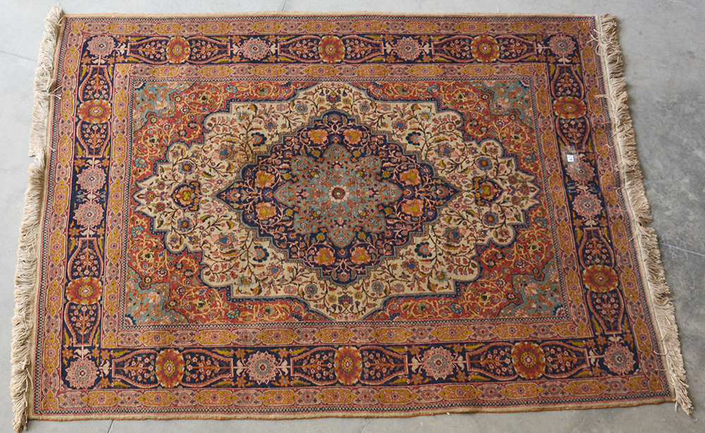 Tappeto Keshan. Persia sec. XX. Disegno a medaglione blu su fondo bianco decorato con fiori in policromia (cm 190x144) (difetti)