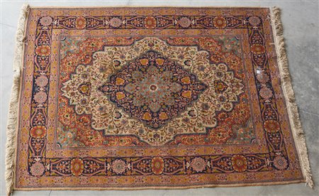 Tappeto Keshan. Persia sec. XX. Disegno a medaglione blu su fondo bianco...