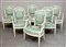 Gruppo di sei poltrone in legno laccato, schienale a scudo, braccioli a ricciolo, gambe scanalate intagliate all'attacco, rivestite in seta verde decorata a fiori, lacca di epoca posteriore. Sec. XIX. (difetti)