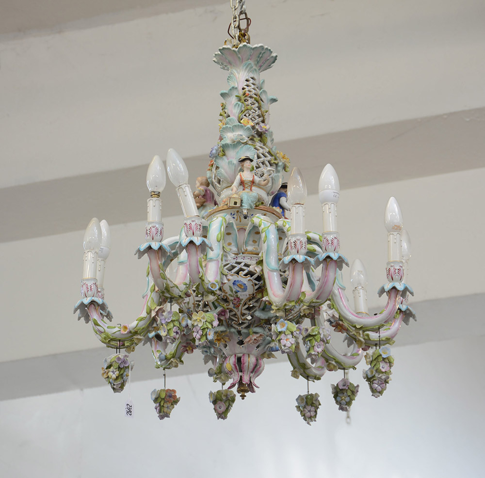 Manifattura italiana. Lampadario a dosici luci in ceramica policroma decorato con figure di contadini, fiori, foglie e volute dipinti a foglie (difetti e mancanze)