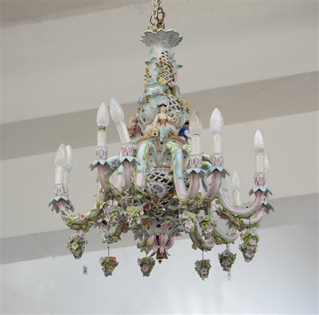 Manifattura italiana. Lampadario a dosici luci in ceramica policroma decorato...