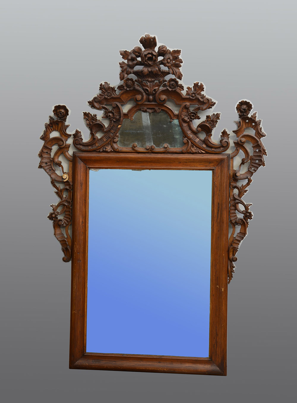 Specchiera rettangolare con cimasa applicata, scolpita e intagliata, di gusto rocaille. Veneto, fine secolo XVIII (cm 122x180) (difetti)