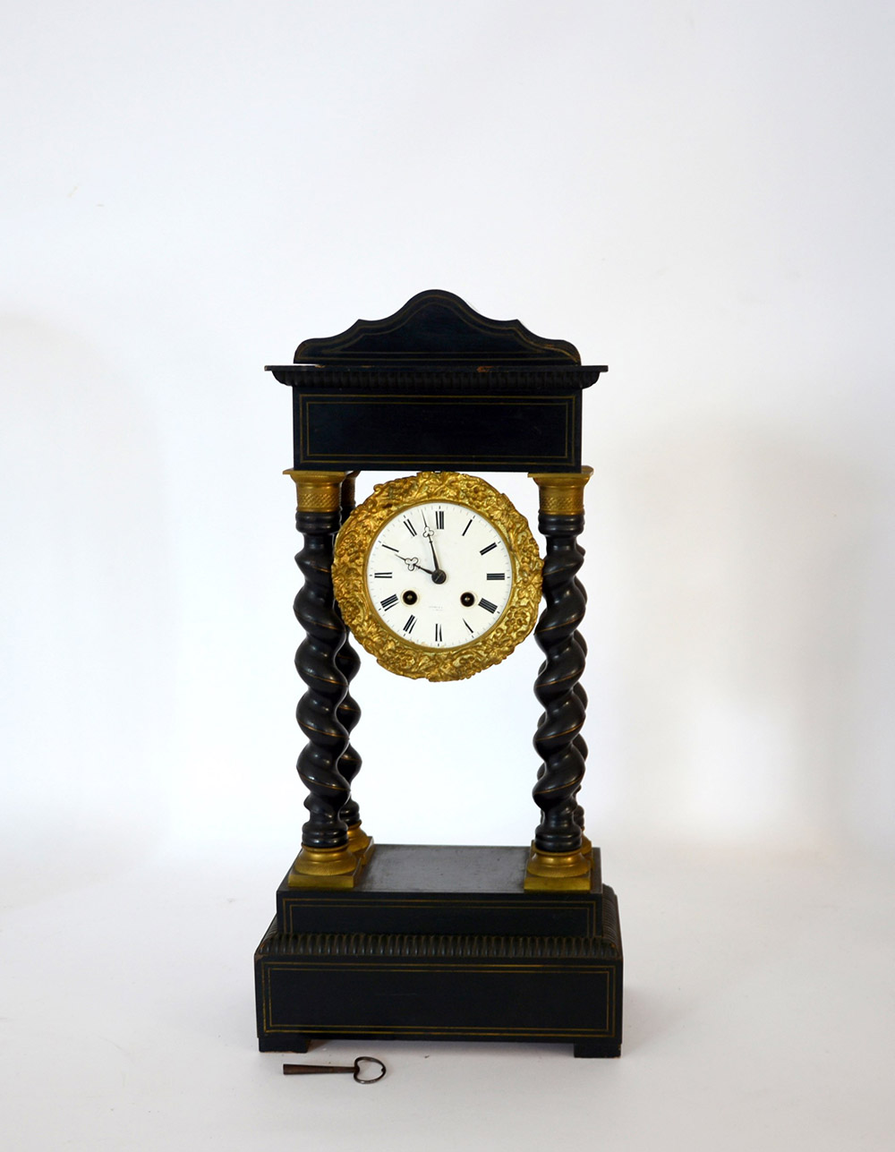 0 0 Orologio a pendola con colonne a torciglione, movimento con carica settimanale suoneria delle ore e delle mezze, sospensione a molla, quadrante in smalto bianco con cifre romane (h cm 50 circa) (mancanze)
