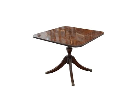 Tavolo breakfast quadrato in stile Sheraton con piano a vela filettato, colonna tornita poggiante su quattro gambe desinenti a zampa ferina in ottone. Inghilterra, sec. XIX (cm 90x75x90) (difetti)