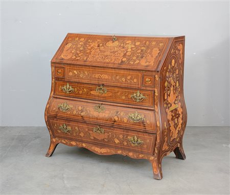 Ribalta con fronte mosso a tre cassetti e due piccoli sotto il piano, scarabattolo celante cassettini e vani porta lettere, interamente intarsiato con elementi floreali ed uccelli. Olanda, sec. XIX (cm 102x109x58) (difetti e mancanze)