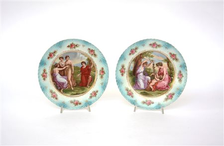 Coppia di piatti decorativi in porcellana raffiguranti scene allegoriche (d...