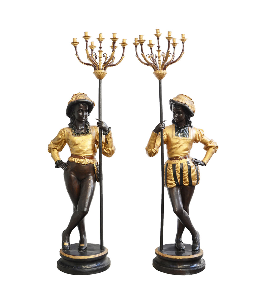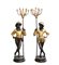 Coppia di lampade statuarie a sette luci a forma di paggi in metallo brunito...