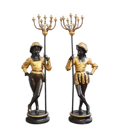 Coppia di lampade statuarie a sette luci a forma di paggi in metallo brunito e dorato su basamento circolare (h. cm 200)