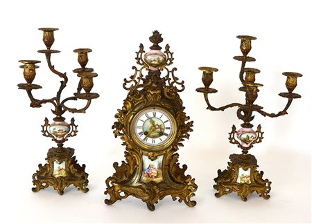 ANONIMO Trittico da camino in bronzo decorato con placche in porcellana policroma a paesaggi e scene galanti composto da pendola e due candelieri. Pendola con movimento a carica settimanale, suoneria delle ore e delle mezze su campanello, sospensione brocot, quadrante con cifre romane (pendola h cm 47 circa)