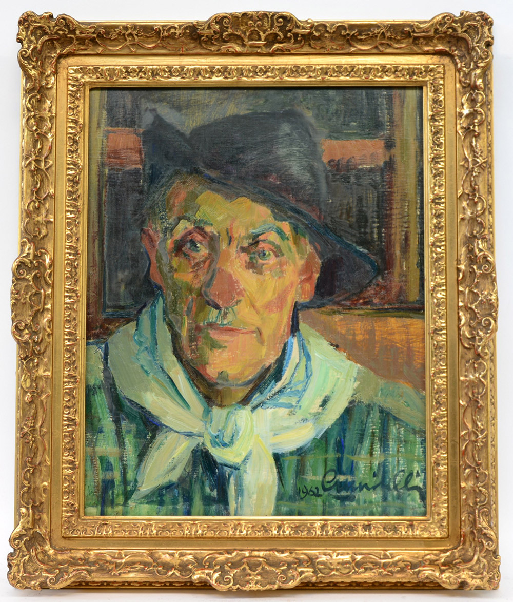 Firma indecifrata "Uomo con cappello" 1962, olio su tela (cm 50x40) Firmato e datato in basso a destra. In cornice