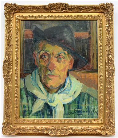 Firma indecifrata "Uomo con cappello" 1962, olio su tela (cm 50x40) Firmato e...