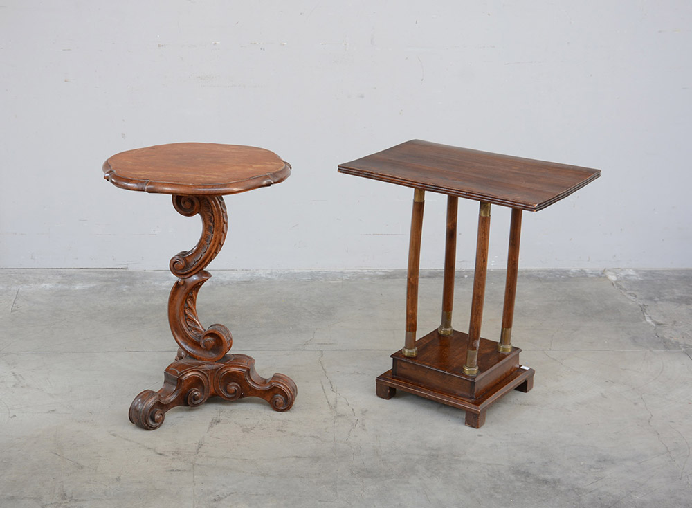 Lotto composto da due tavolini, tondo e rettangolare, di fatture differenti (difetti)