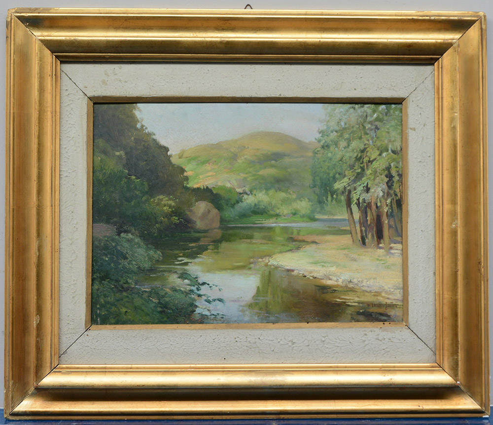 Lavagnini Primo Siena 1889 Milano 1964 "Il Lambro sotto Carate"olio su compensato (cm 28x39) firmato in basso a destra, firmato, datato e titolato al verso, in cornice