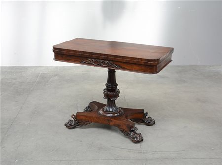 Tavolo da gioco in noce con piano apribile, montante a colonna scolpita e piedi leonini (cm 91x71x45) (lievi difetti)