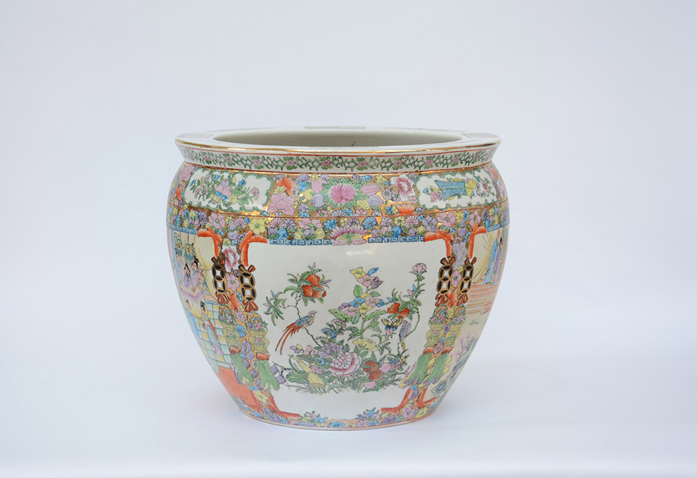 Grande cache-pot in porcellana Famiglia Rosa e dorature decorato con scene di...
