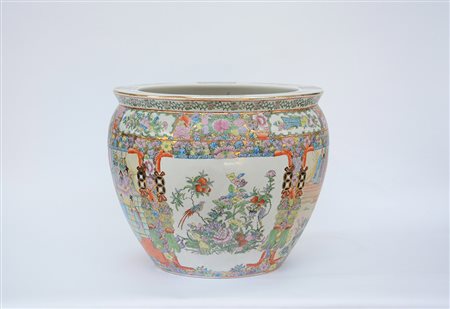Grande cache-pot in porcellana Famiglia Rosa e dorature decorato con scene di palazzo e motivi floreali, con base in legno (lievi difetti) Cina, sec. XX (diam. 47 cm.)