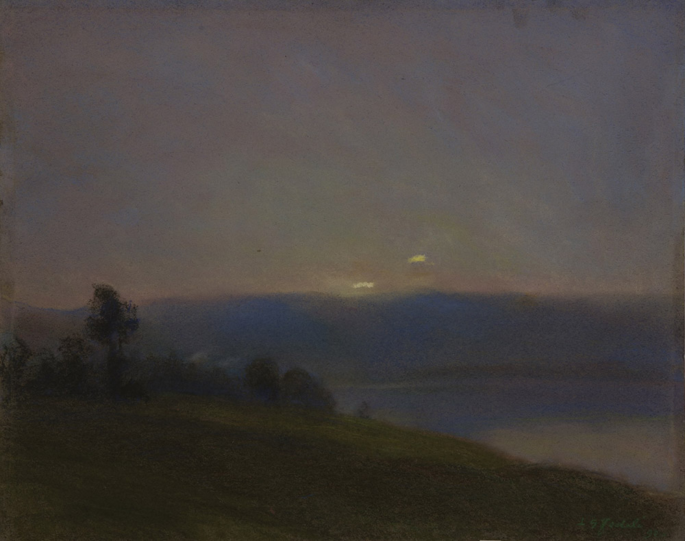 Firma indecifrata "Paesaggio lacustre" 1920. Pastelli su carta (cm 40x50) firmato e datato in basso a destra, in cornice dorata (difetti)