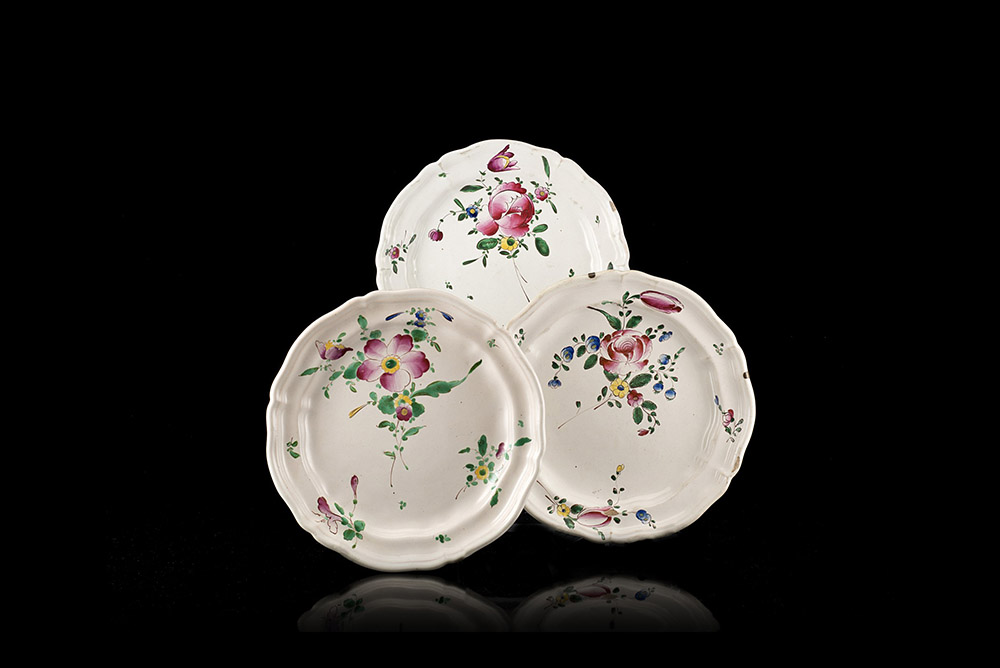 Tre piatti tondi mistilinei in maiolica con decoro policromo al terzo fuoco ‘alla rosa’. Due piatti recano al verso segno di passaggio (chiodo) in blu. Lodi, sec. XVIII (d. cm 24 ca.) (sbeccature, usure e cadute di smalto)