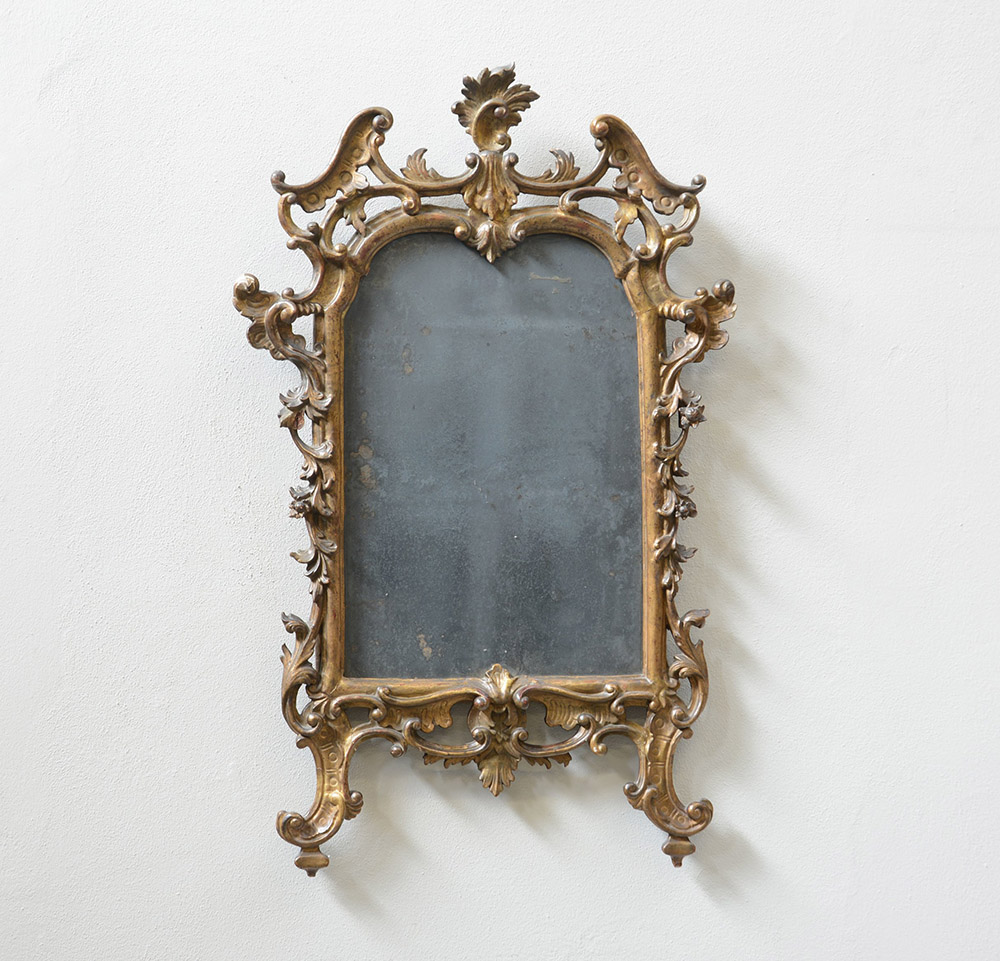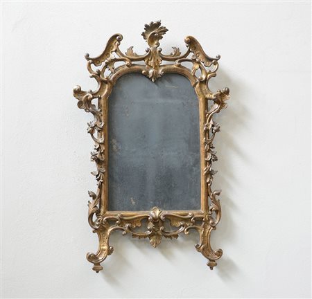 Specchiera da appoggio in legno dorato e intagliato a volute e foglie di acanto, sec. XVIII (cm 110x70) (difetti)