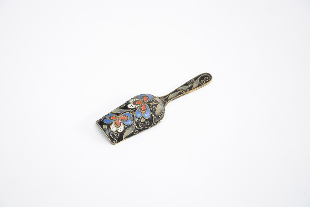 Cucchiaino in argento dorato e smalti cloissonè. Russia, anni '50 del sec. XX (largh. cm 9) (lievi difetti)