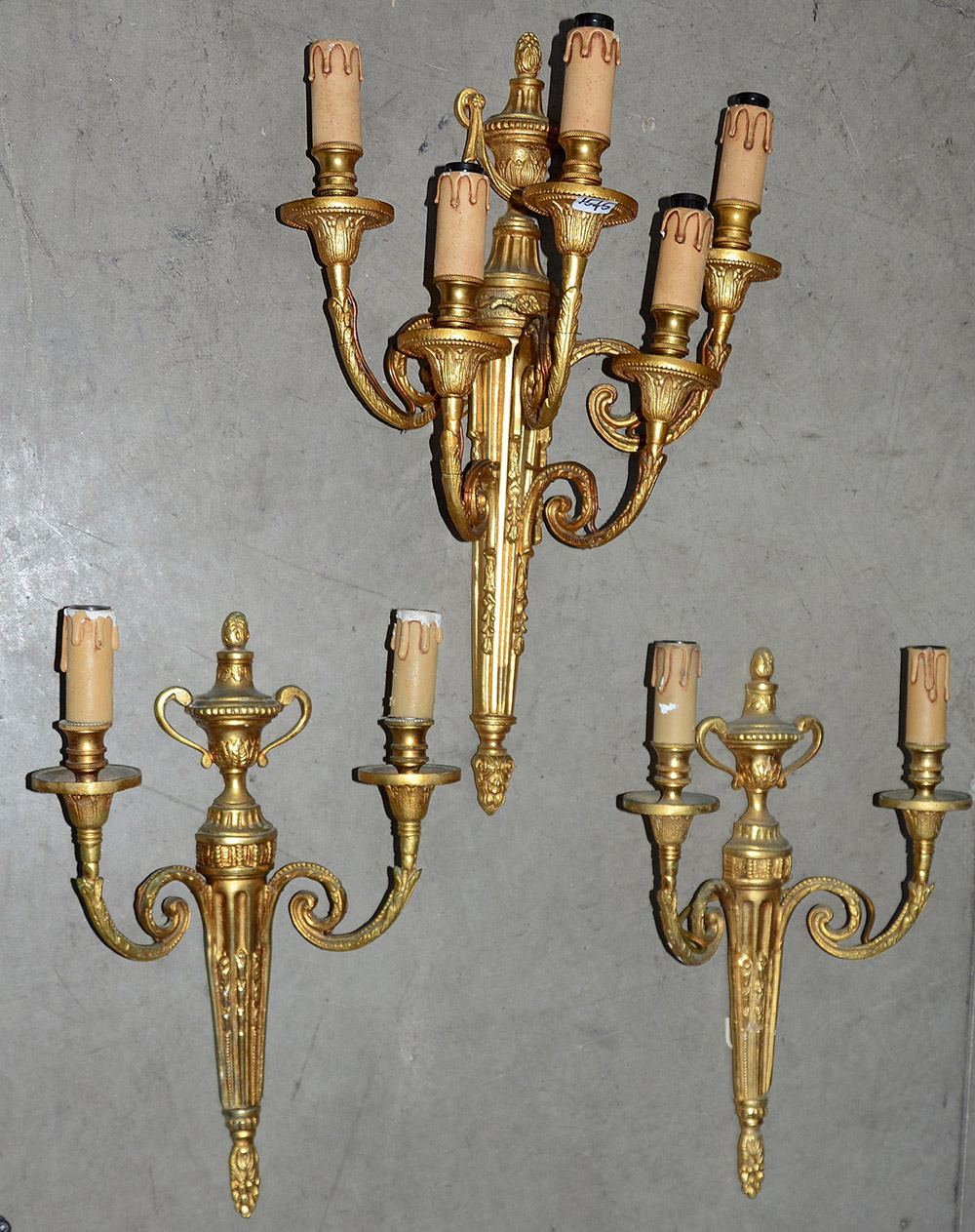 Lotto composto da due applique a due luci e una cinque luci in bronzo dorato (h cm 40 e 50 circa) (difetti)