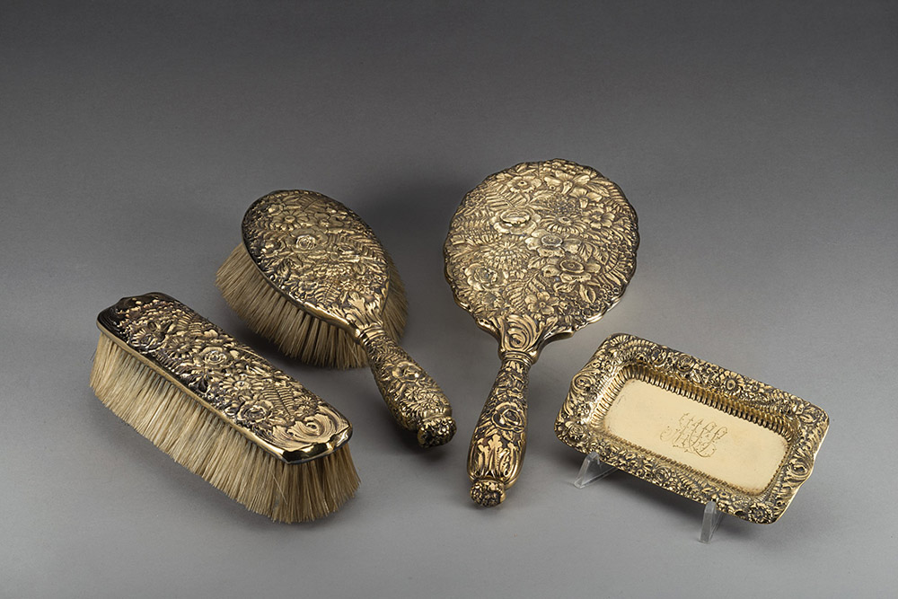 Servizio da toilette composto da due spazzole, uno specchio ed un piccolo vassoio in argento dorato e sbalzato a motivi floreali. Stati Uniti, fine sec. XIX. Argenterie Tiffany&Co. (difetti)