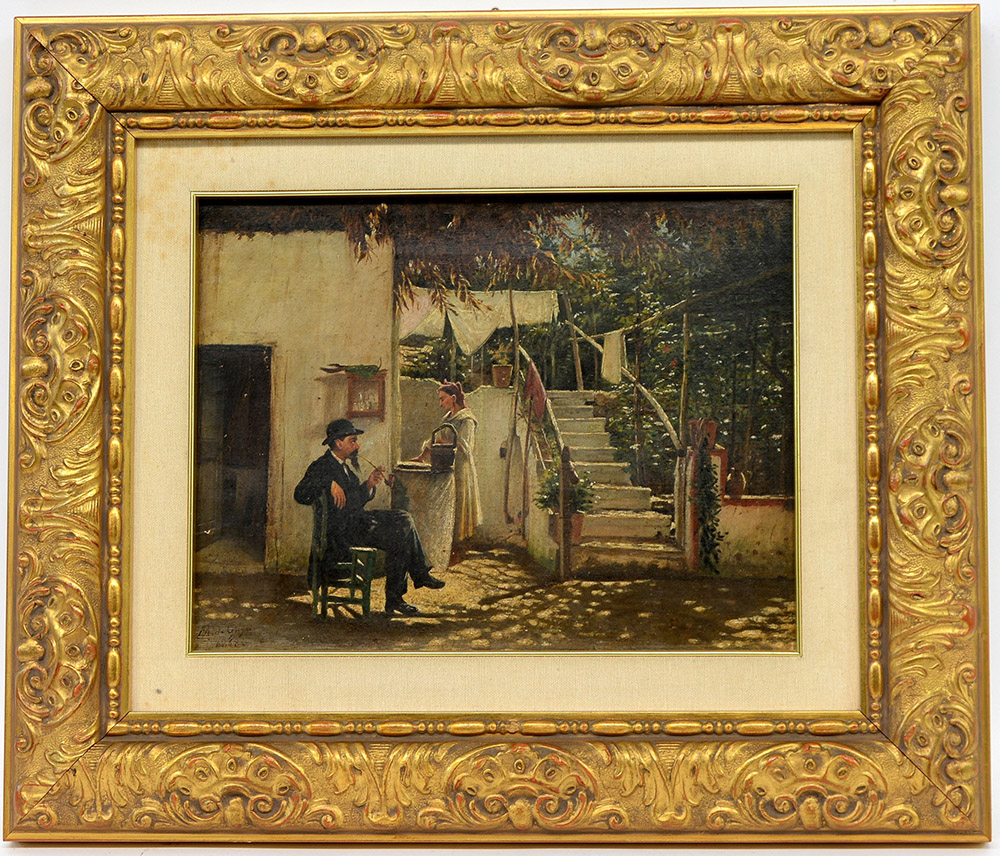 Marco De Gregorio Resìna 1829 1876 "Sotto al pergolato" olio su tela (cm 27x36) firmato e datato in basso a sinistra.In cornice (difetti)