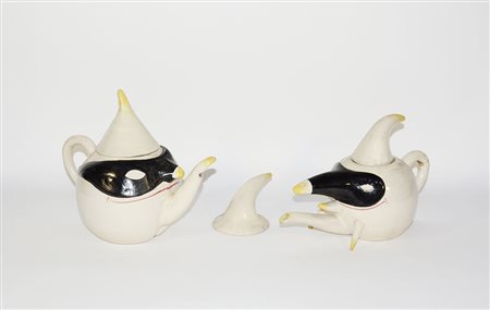 Manifattura Ceramica Solimene, Vietri sul Mare Due caffettiere in ceramica dipinta raffiguranti Pulcinella, unite a un coperchio analogo. Napoli, seconda metà sec XX (h max cm 27) (difetti)