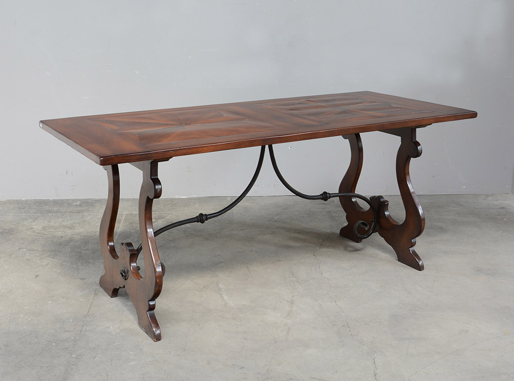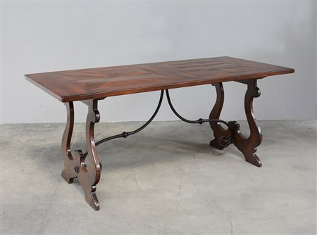 Tavolo in stile seicentesco spagnolo con sostegni a trespolo e sproni in ferro battuto, piano con tarsie a forma di stella (cm 181x78x80) (difetti)