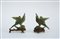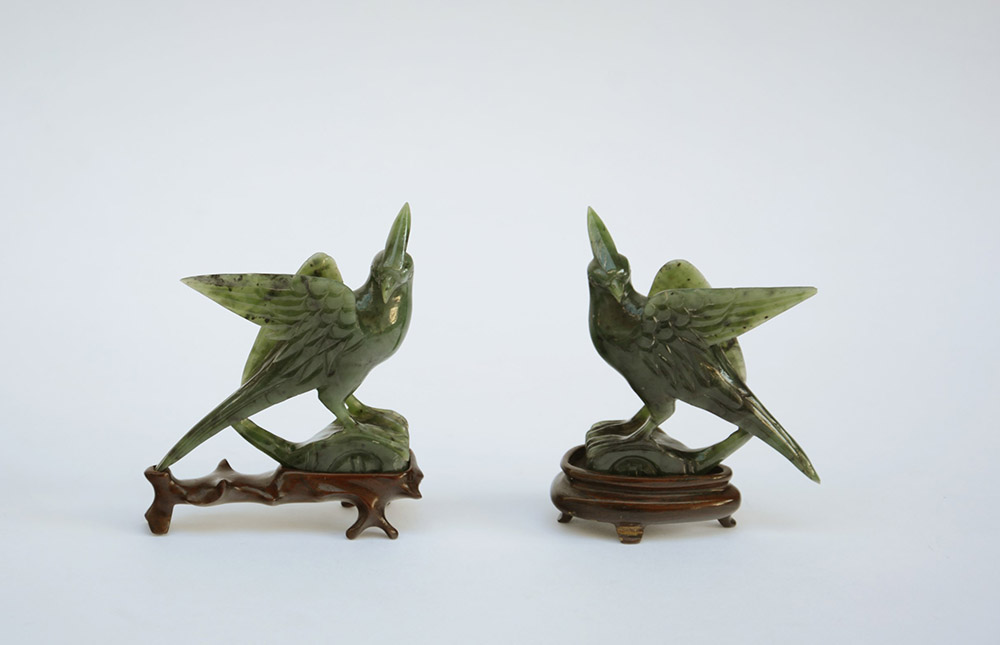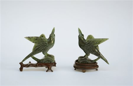 Coppia di volatili in giada color spinacio, con basi in legno (difetti) Cina, prima metà sec. XX (h. 9 cm.)