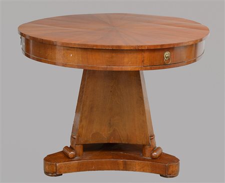 Tavolo tondo "stile impero" in noce con tre cassetti nella fascia e sostegno...
