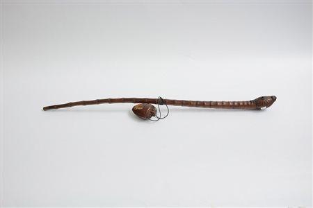 Pipa in bambù con applicazioni in metallo inciso e portatabacco con presa del coperchio a cane di pho (lungh. cm 73) (difetti)