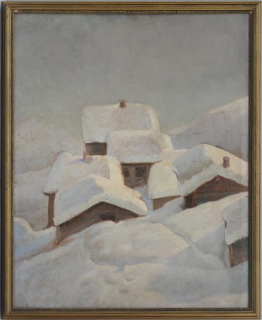 Micheletti Mario "Baite sotto la neve" olio su compensato (cm 68x54) firmato in basso a sinistra. In cornice