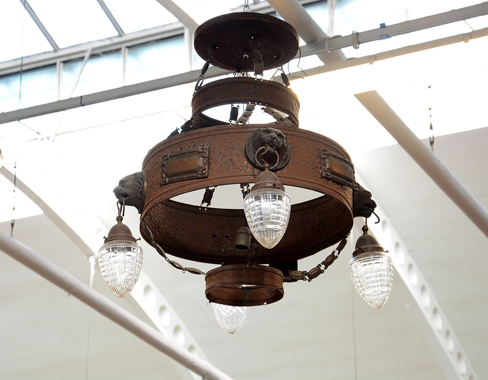 Lampadario a cinque luci in metallo decorato con teste di animali e bocce in vetro (difetti e mancanze)